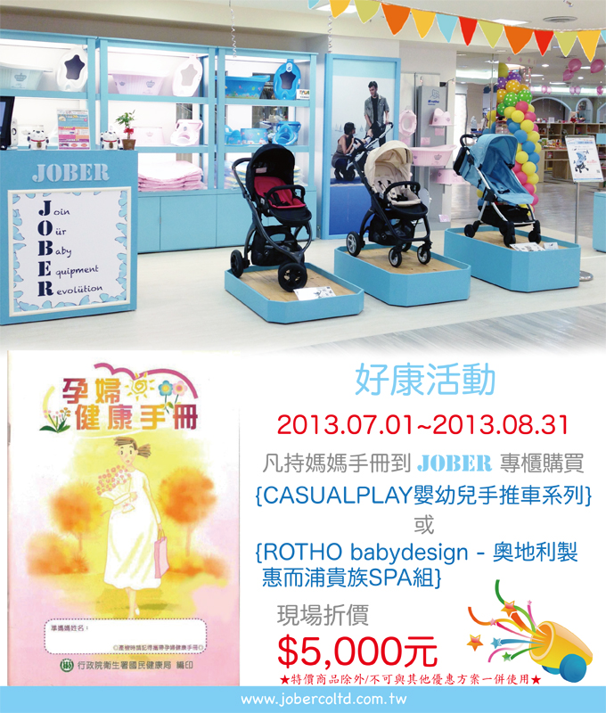 凡於活動期間憑媽媽手冊於JOBER專櫃購買casualplay西班牙嬰幼兒手推車或ROTHO babydesign 奧地利製惠而浦貴族SPA組,