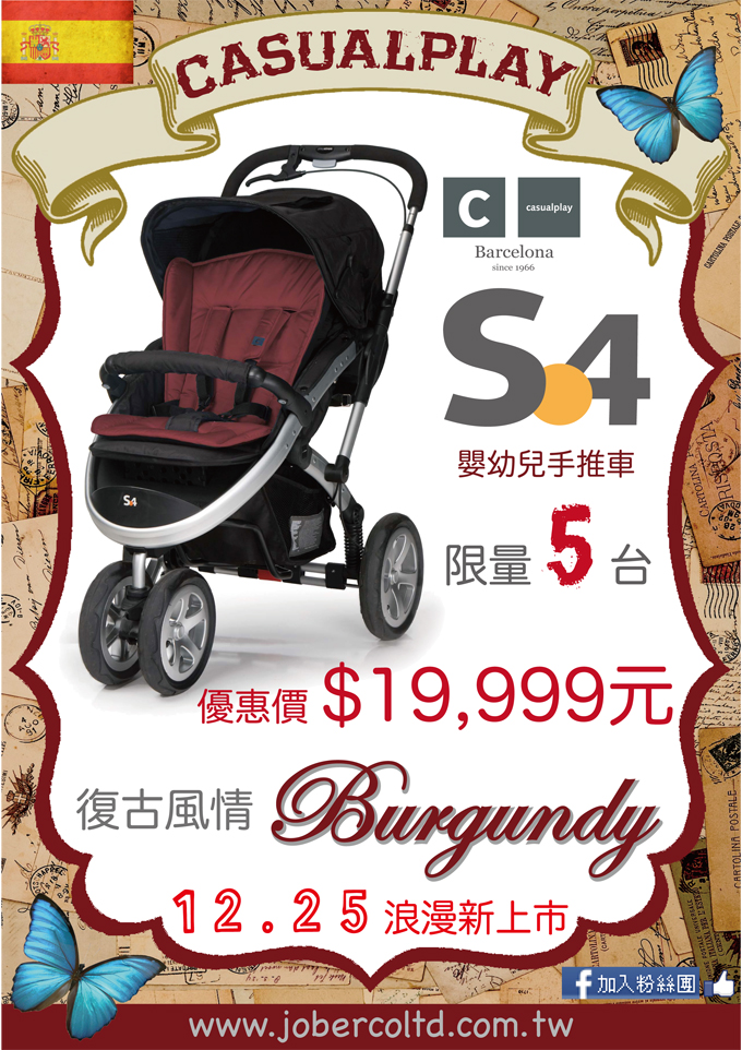 CASUALPLAY西班牙品牌-S4嬰幼兒手推車.復古新色Burgundy.聖誕節當天浪漫上市!